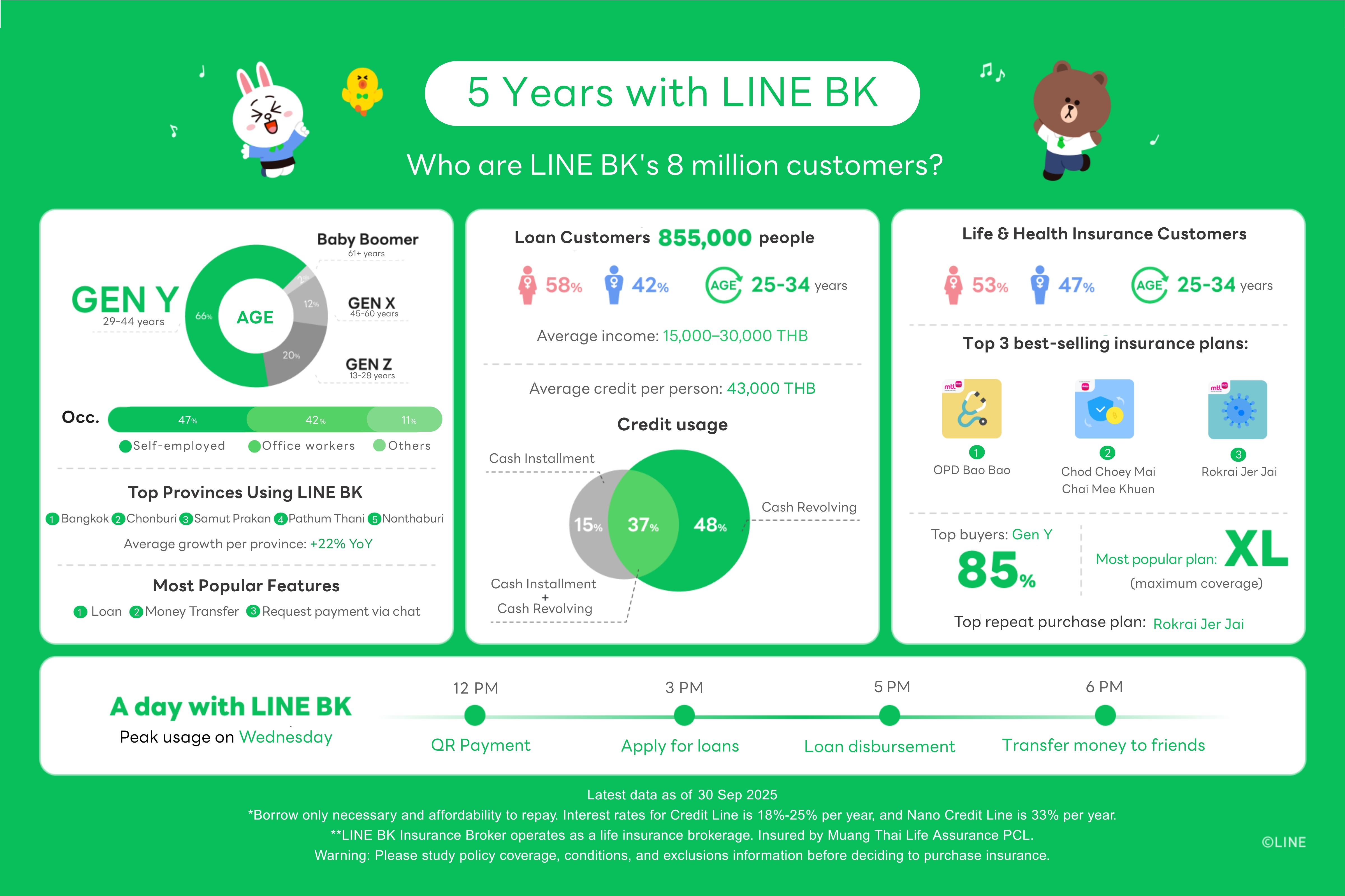 Tana Pothikamjorn, Chief Executive Officer of KASIKORN LINE Co., Ltd., stated: "Over the past five years, LINE BK has facilitated financial convenience for Thai people by showcasing the concept of 'Banking in Your Hand.' Whether opening saving accounts, scanning QR codes for payments, applying for loans, saving money, or purchasing insurance—everything can be done within a LINE app. We currently serve over 8 million trusted customers and will continue advancing to become a true everyday financial partner for Thai people."