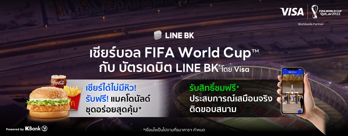 • สิทธิพิเศษสำหรับผู้ถือบัตรที่ถือบัตรเดบิต LINE BK (“ลูกค้า”) ของบริษัท กสิกร ไลน์ จำกัด (“LINE BK”) ทุกประเภท ได้แก่ บัตรเดบิต บัตรเดบิตออนไลน์ และ บัตรเดบิตคู่วงเงิน โดยลูกค้าที่มียอดใช้จ่ายสูงสุด ณ ร้านค้าที่จดทะเบียนเป็นร้านค้าภายในประเทศไทยระหว่างวันที่ 1-31 ตุลาคม 2565 จำนวน 50 คนแรก มีสิทธิ์รับรหัส Visa All Access จากบริษัท วีซ่า อินเตอร์เนชั่นแนล (ประเทศไทย) จำกัด (“Visa”) เพื่อเข้าชมและสัมผัสประสบการณ์บอลโลก FIFA World Cup 2022™ เสมือนจริงทั้งก่อนและหลังการแข่งขัน จำนวน 1 รหัส/สิทธิ์