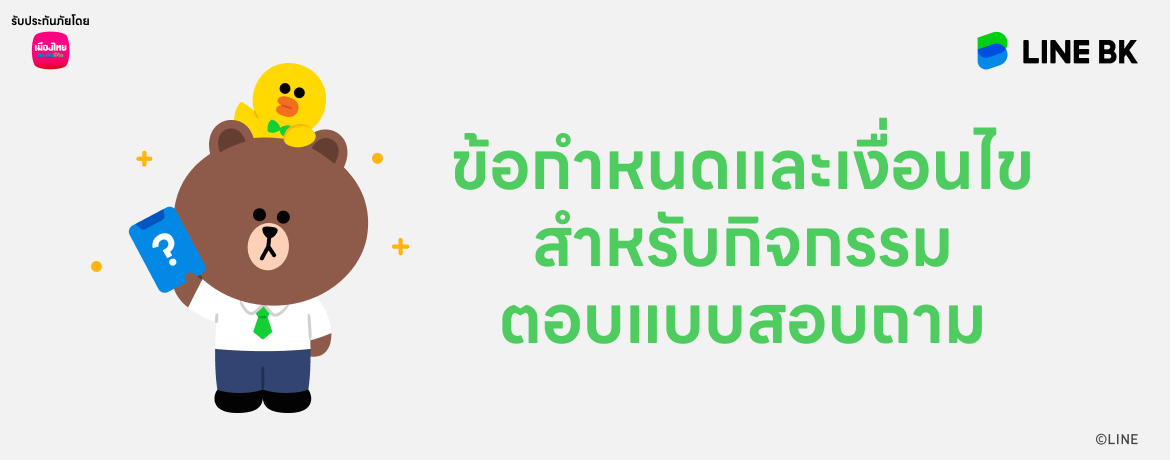 - สิทธิพิเศษสำหรับลูกค้าบริษัท กสิกร ไลน์ อินชัวร์รัน โบรกเกอร์ จำกัด (“LINE BK Insurance Broker”) ที่ตอบแบบสอบถามที่ได้รับผ่านช่องทาง LINE Official Account ของ LINE BK ตั้งแต่วันที่ 25 ตุลาคม 2567 – 8 พฤศจิกายน 2567