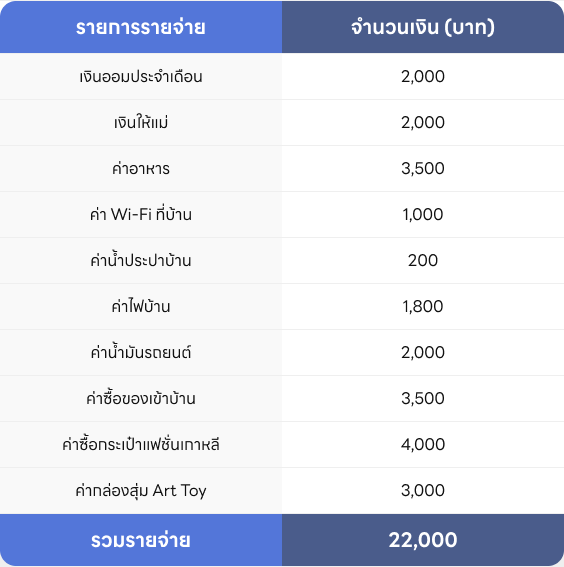 “นายวศิน เป็นพนักงานบริษัท เขาได้รับเงินเดือนอยู่ที่ 20,000 บาท เมื่อวันที่ 1 พฤศจิกายน 2566 ที่ผ่านมา เขาเพิ่งถูกลอตเตอรี่เลขท้าย 2 ตัว 1 ใบ เป็นจำนวนเงินทั้งหมด 2,000 บาท เท่ากับว่าในเดือนนี้ เขามีรายรับทั้งหมดเป็นจำนวน 22,000 บาท เขาดีใจได้ไม่ถึงนาที ก็นึกขึ้นได้ว่าเดือนนี้จะต้องจ่ายค่าน้ำประปาบ้าน 200 บาท ค่าไฟฟ้าบ้าน 1,800 บาท ค่าอาหาร 3,000 บาท ค่า Wi-Fi ที่บ้าน 1,000 บาท เงินออมประจำเดือน 2,000 บาท เงินให้แม่ 2,000 บาท ค่าน้ำมันรถยนต์ 2,000 บาท ค่าซื้อของเข้าบ้าน 2,500 บาท ค่ากระเป๋าแฟชั่นเกาหลี 4,000 บาท และค่ากล่องสุ่ม Art Toy 3,000 บาท รวมเป็น 22,000 บาท”