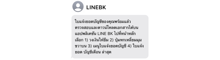 ทั้งนี้ LINE BK ไม่มีนโยบายการส่ง SMS แบบแนบลิงก์ ยกเว้นเฉพาะกรณีที่ลูกค้าเป็นผู้ร้องขอข้อมูลด้วยตนเองเท่านั้น