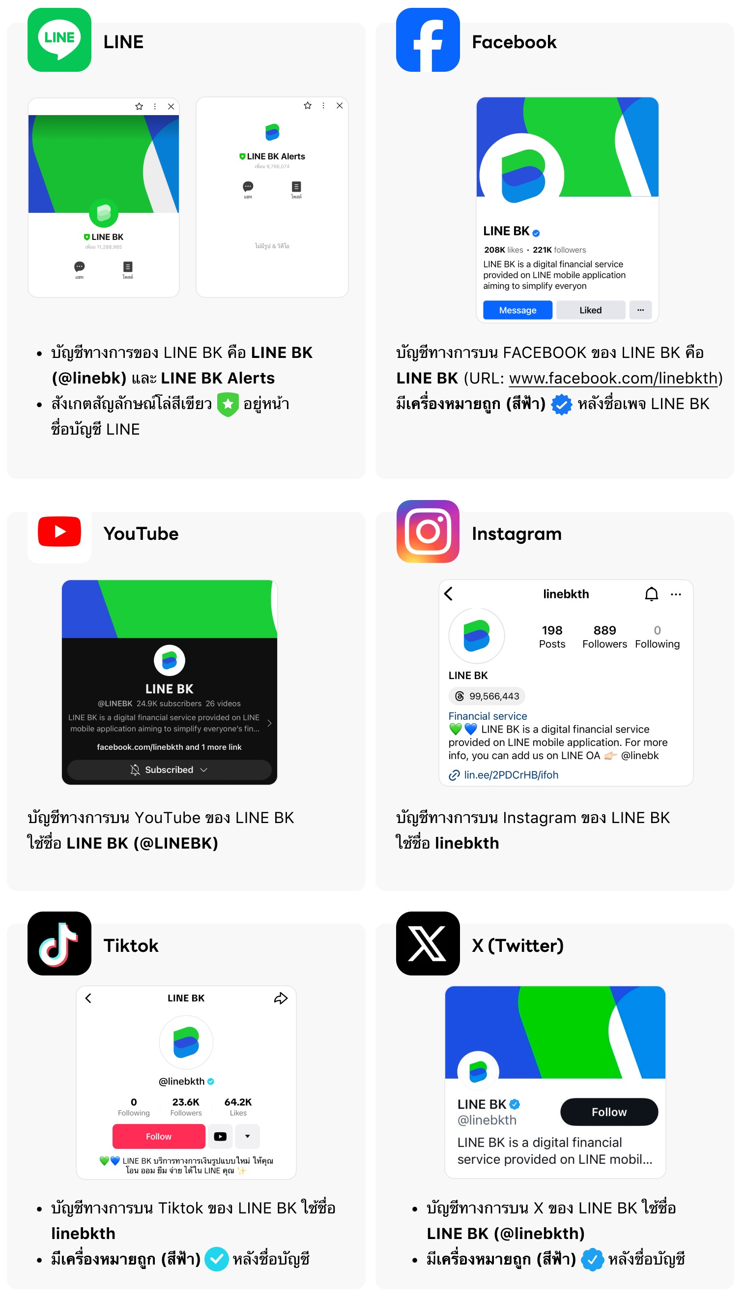 หากต้องการตรวจสอบหรือยืนยันช่องทางการสื่อสารของ LINE BK สามารถติดต่อสอบถามทีมพี่หมี LINE BK ได้ที่ LINE BK Official Account โดยไปยัง "หน้าหลัก" ในแอปพลิเคชัน LINE, กดไอคอน "เพิ่มเพื่อน" ที่มุมขวาบนของหน้าจอ, เลือก “ค้นหา” แล้วพิมพ์ @linebk หรือเลือก “คิวอาร์โค้ด” แล้วสแกนคิวอาร์โค้ดตามด้านล่างนี้เพื่อเพิ่ม LINE Official Account ของ LINE BK เป็นเพื่อน จากนั้นพิมพ์ @linebk ในช่องแชทของ LINE Official Account ของ LINE BK เพื่อสอบถามข้อมูลกับทีมพี่หมีได้โดยตรง